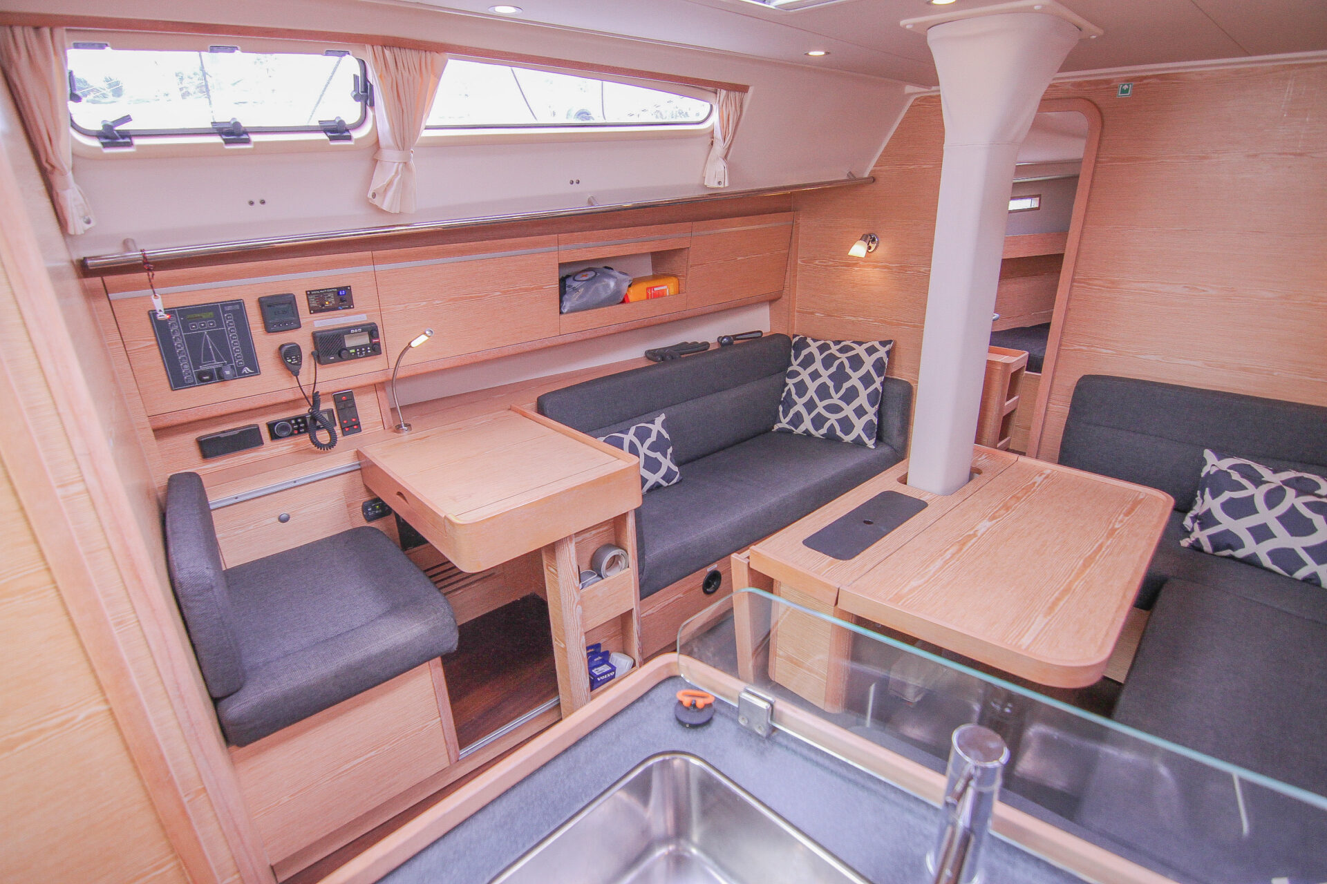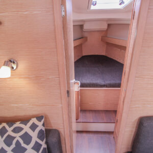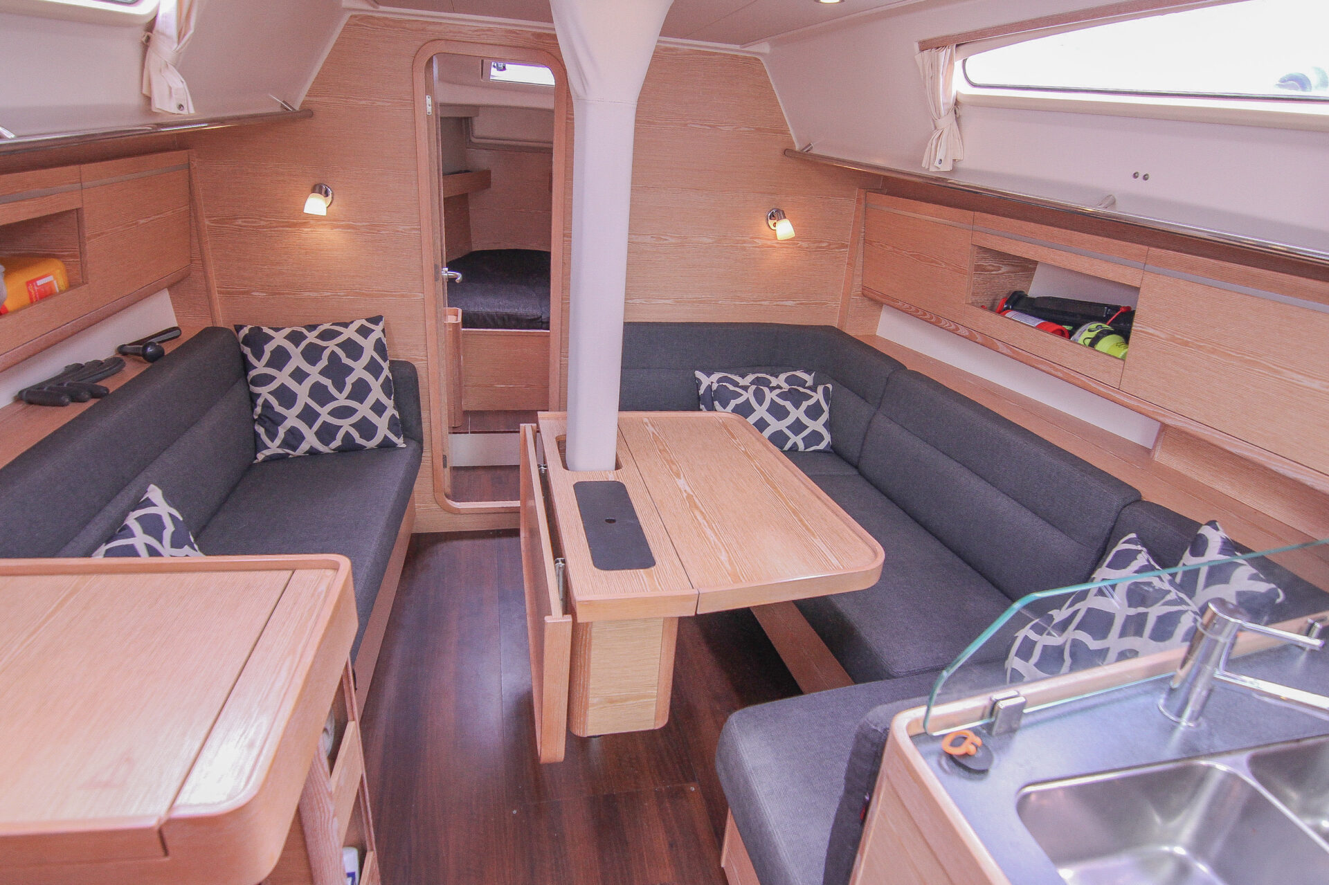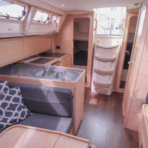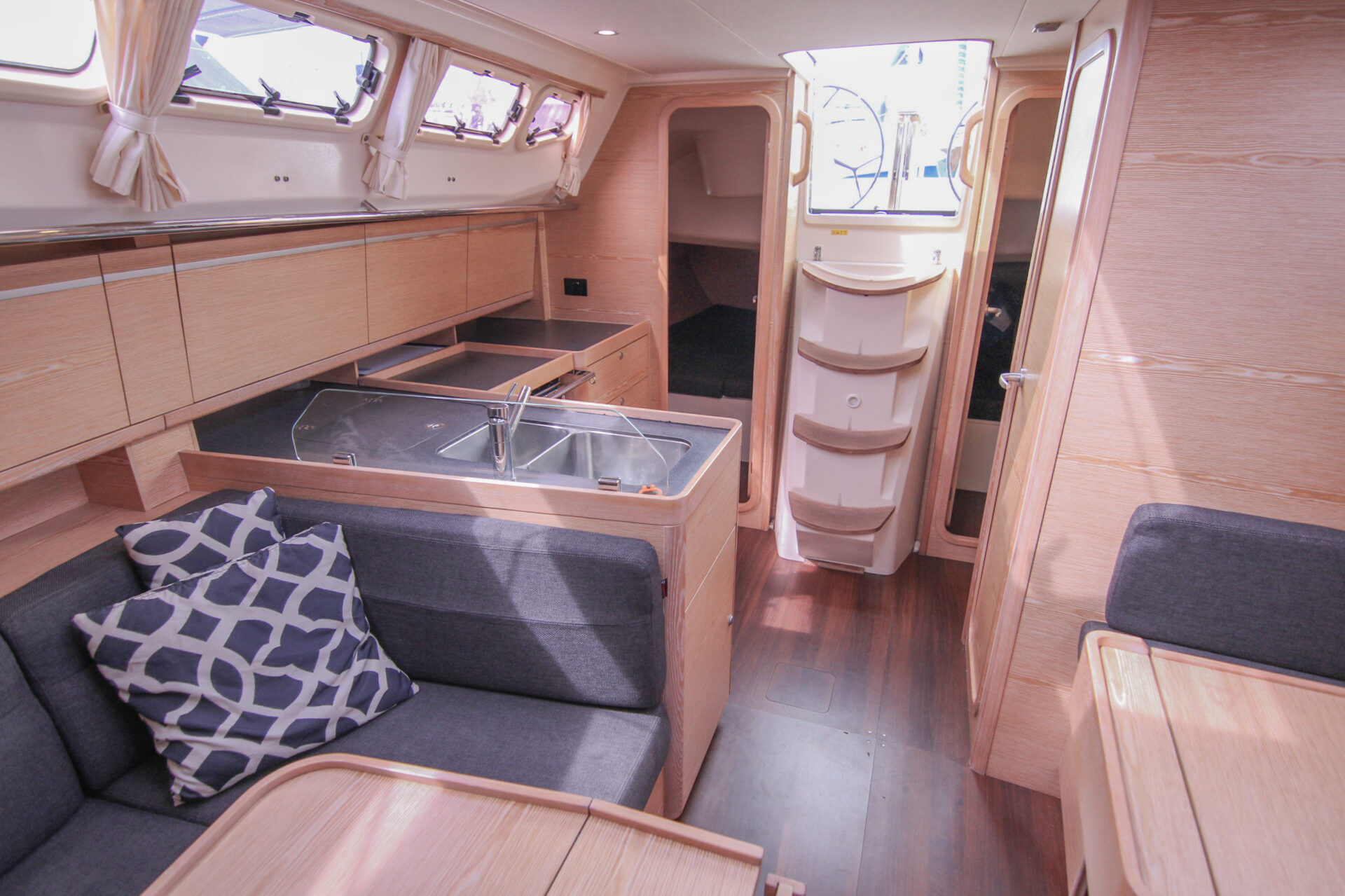 The interior is modern and spacious with a high-quality finish. The configuration of this yacht is three cabins and two bathrooms. Finished with a lite oak interior and dark timber flooring.