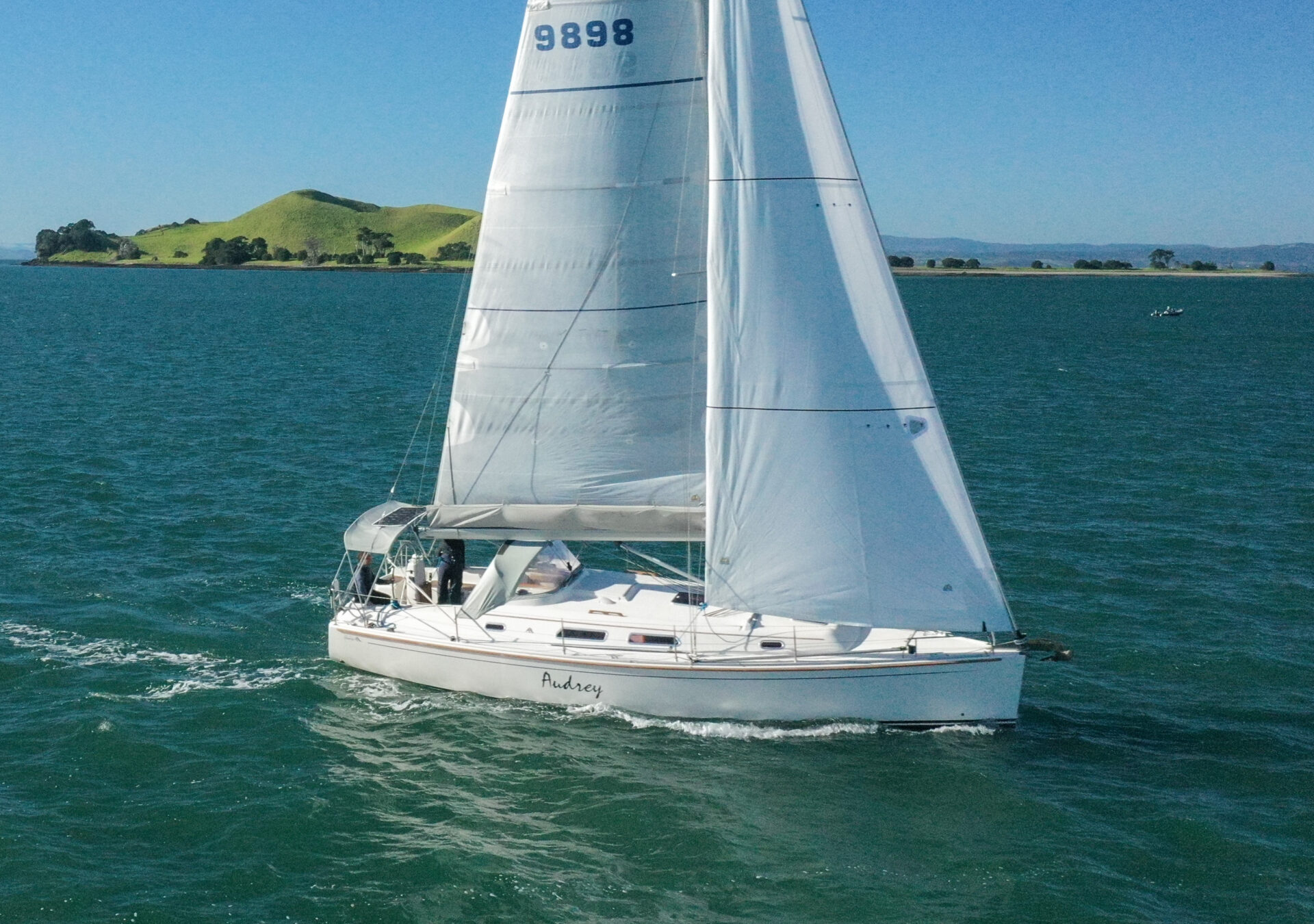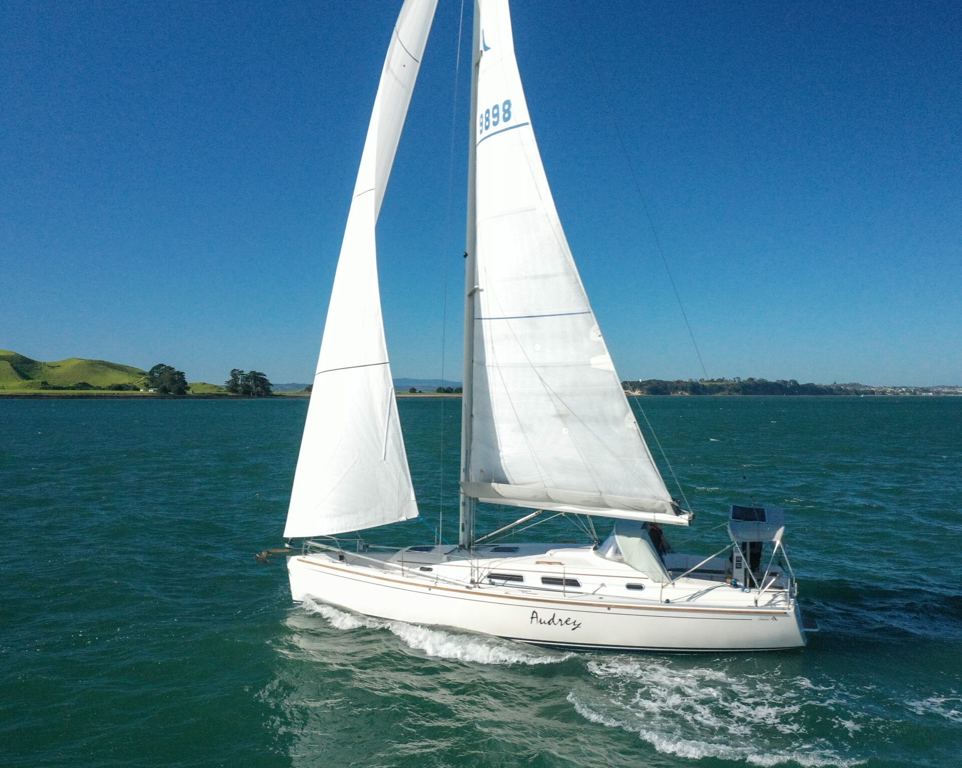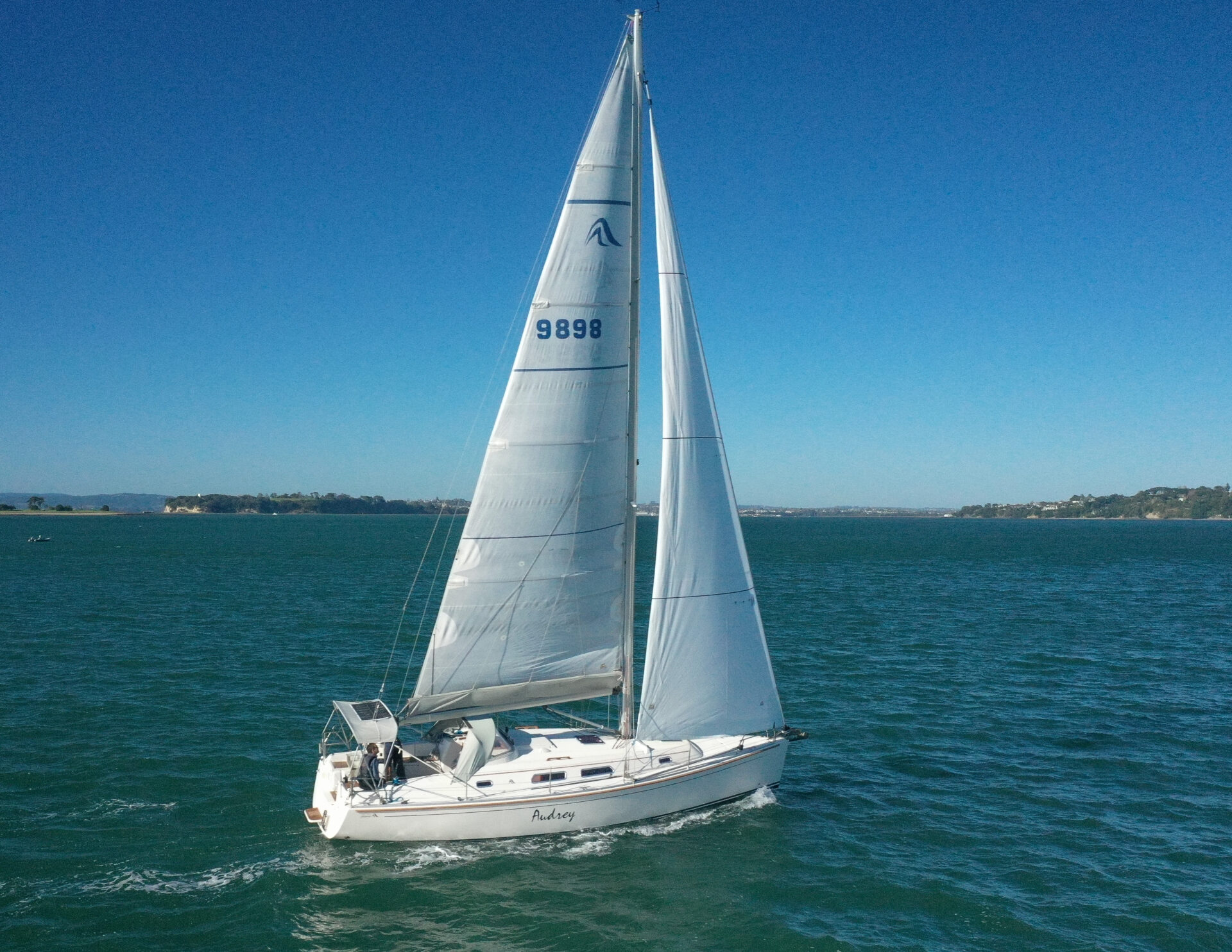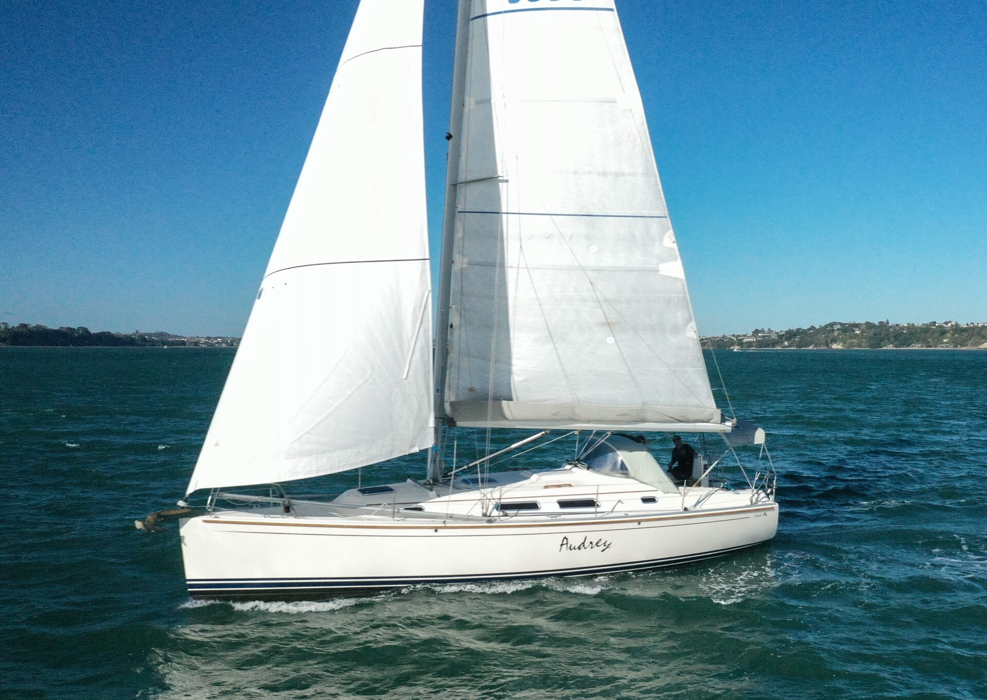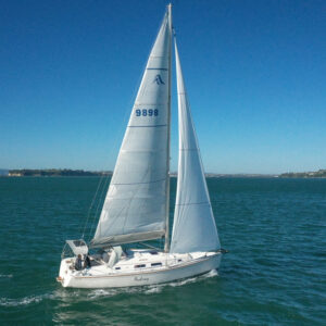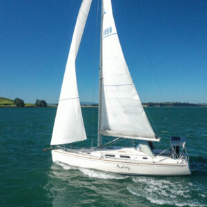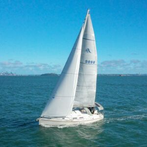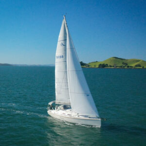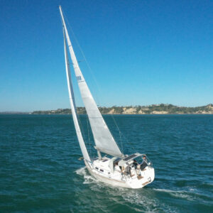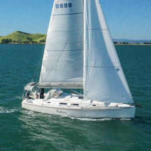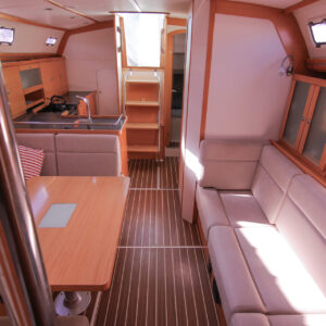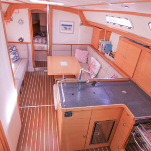 She boasts a good range of sails to cover all wind conditions and set you up for some casual club racing if desired. These include the 2025 Doyles Stratus 600 headsail, Doyles cruising Delta mainsail, Spinnaker with pole, Asymmetric Spinnaker with snuffer and self-tacking jib. The 370e is set up with the mainsail traveller on the coach roof and Audrey has the powered sheet winches for easy short-handed sailing. The electronics have been upgraded to B&G.