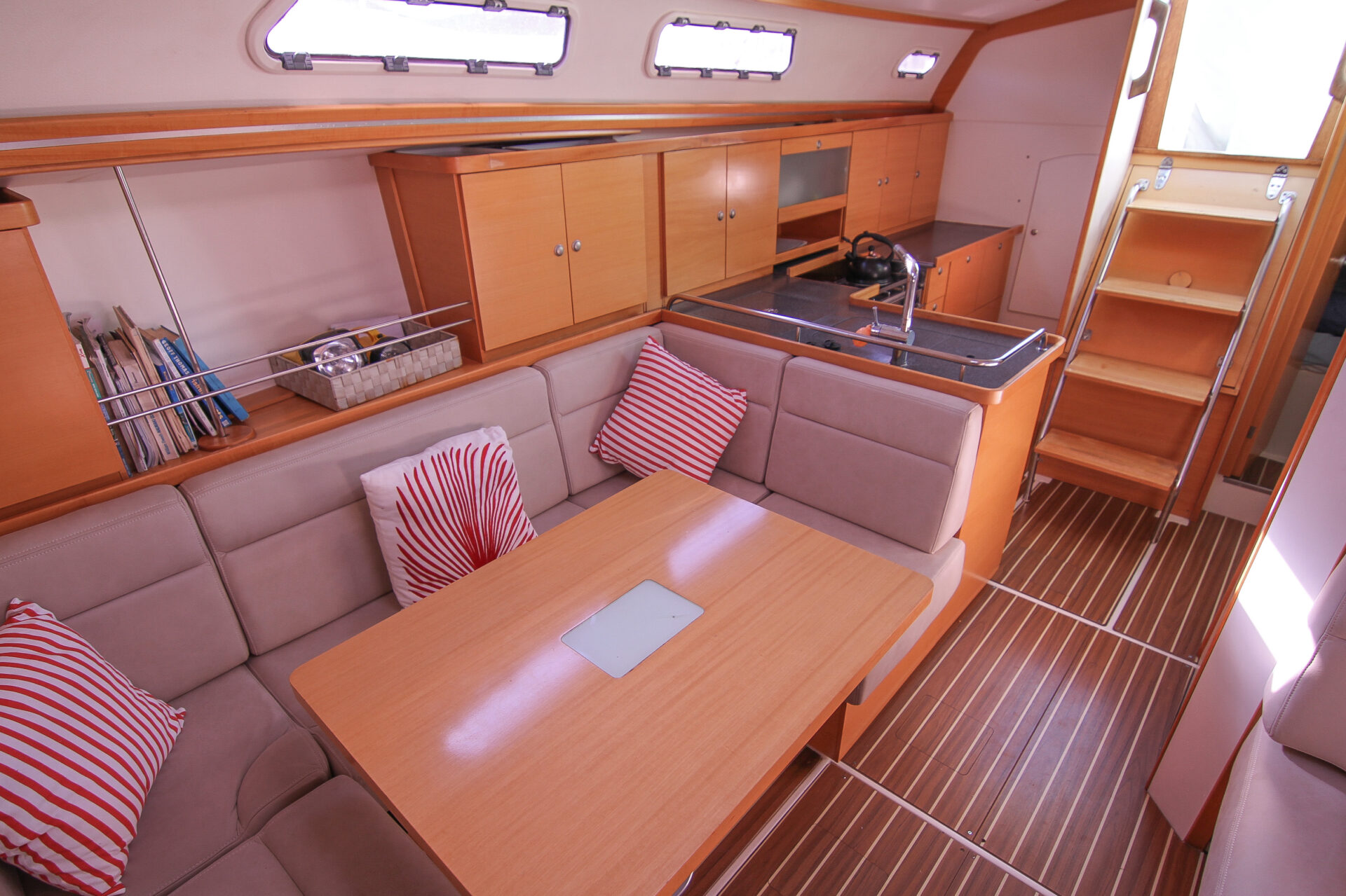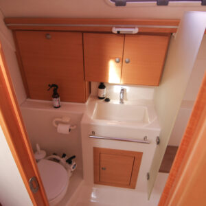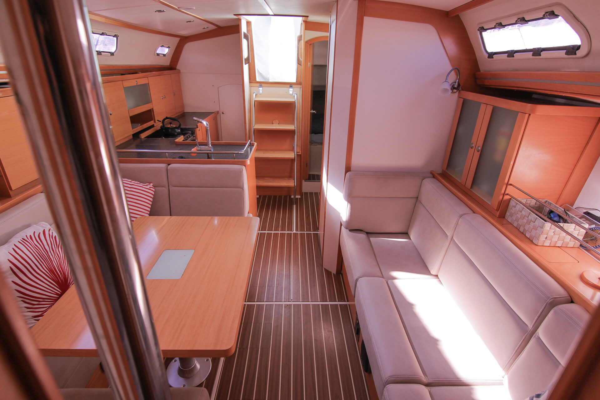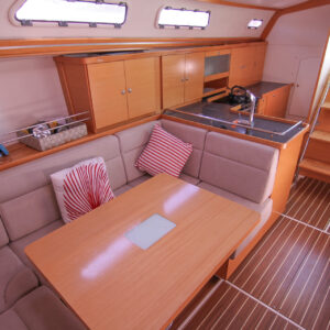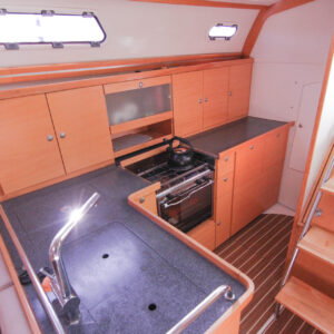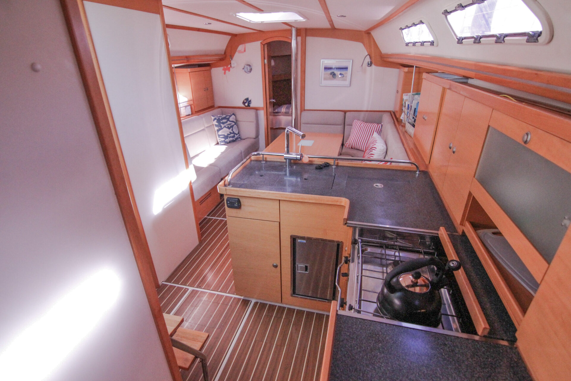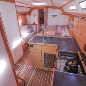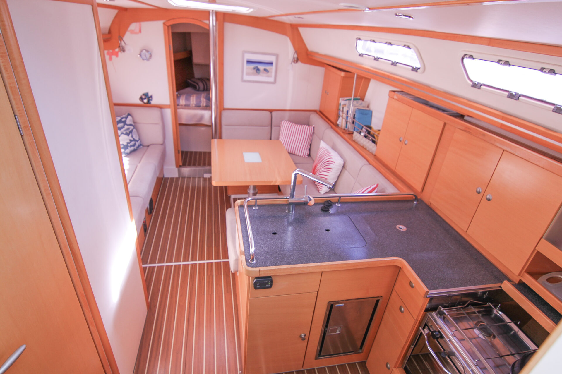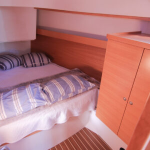 This is the 2.5 cabin configuration providing a master cabin forward, a large aft cabin and a utility room with squabs that can double up as a third small cabin. The additional benefit of this layout is the enlarged galley with additional bench space and storage.
