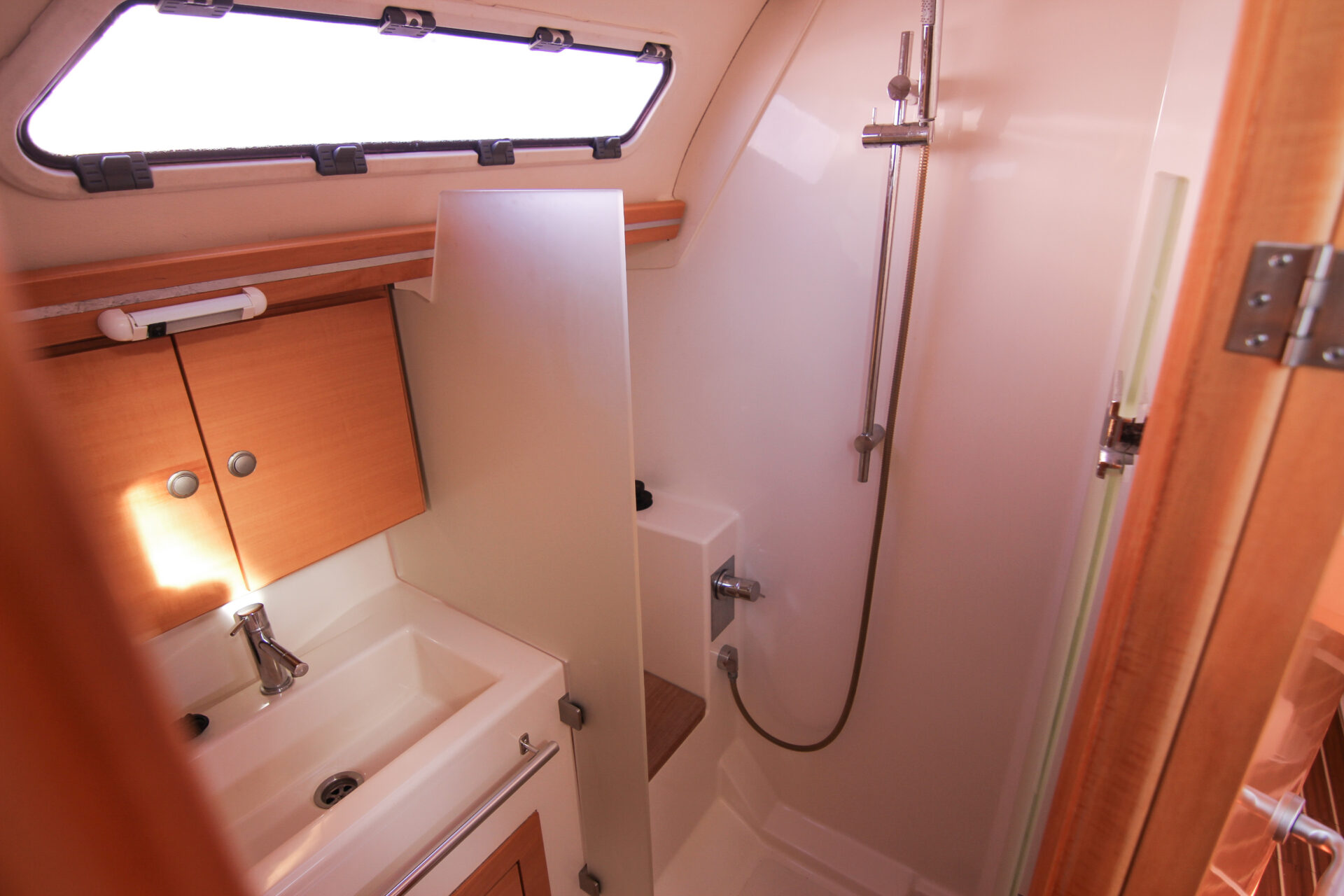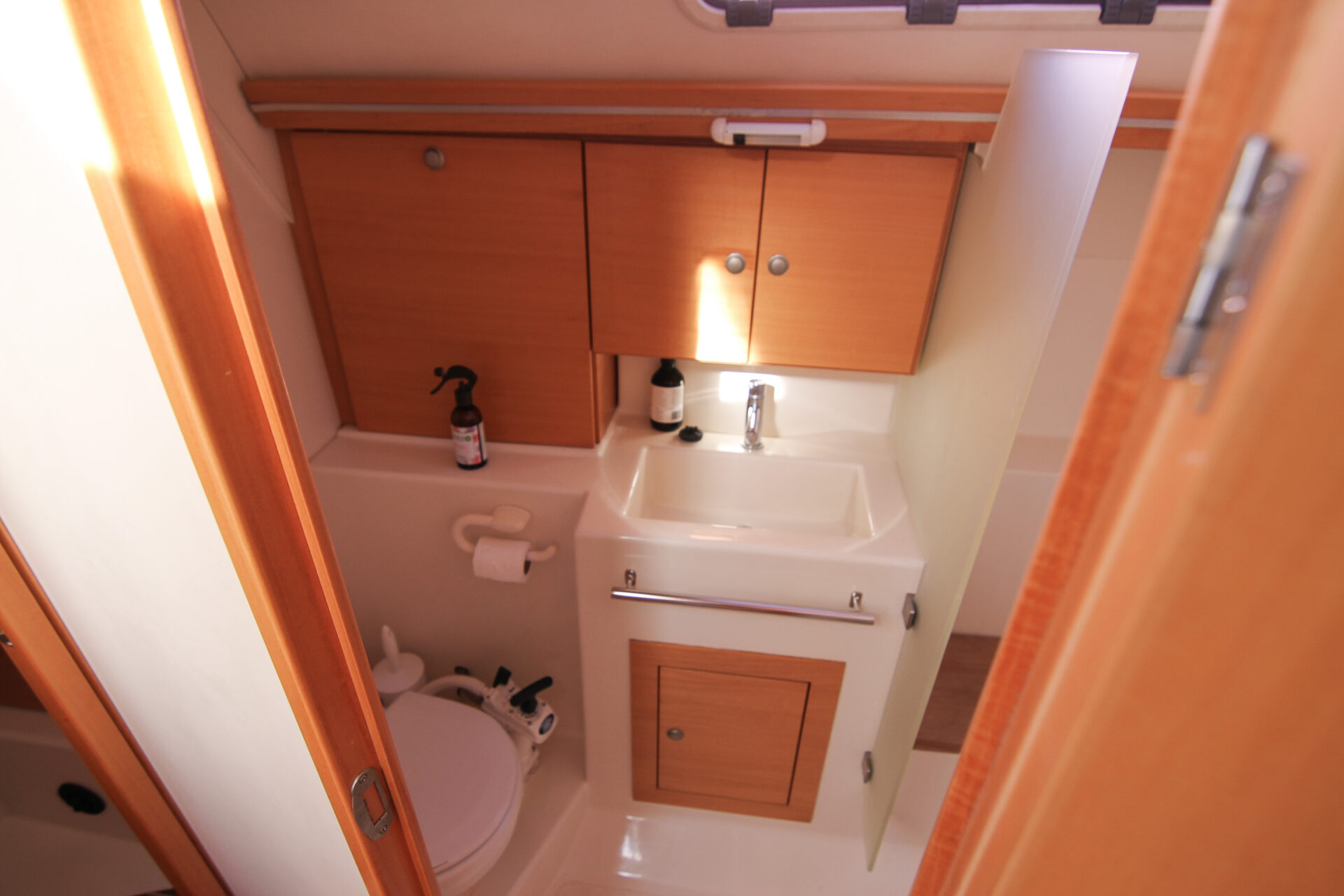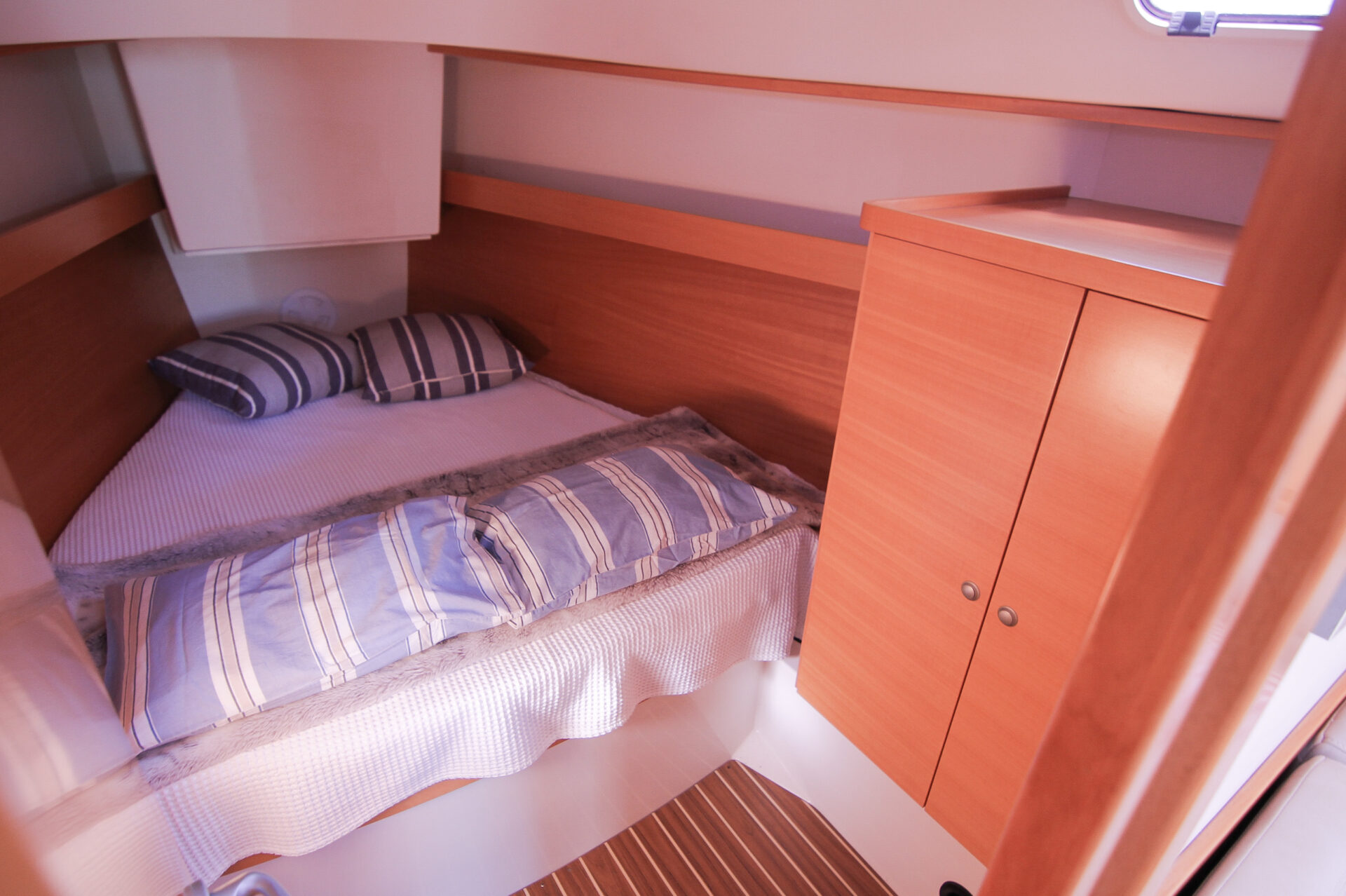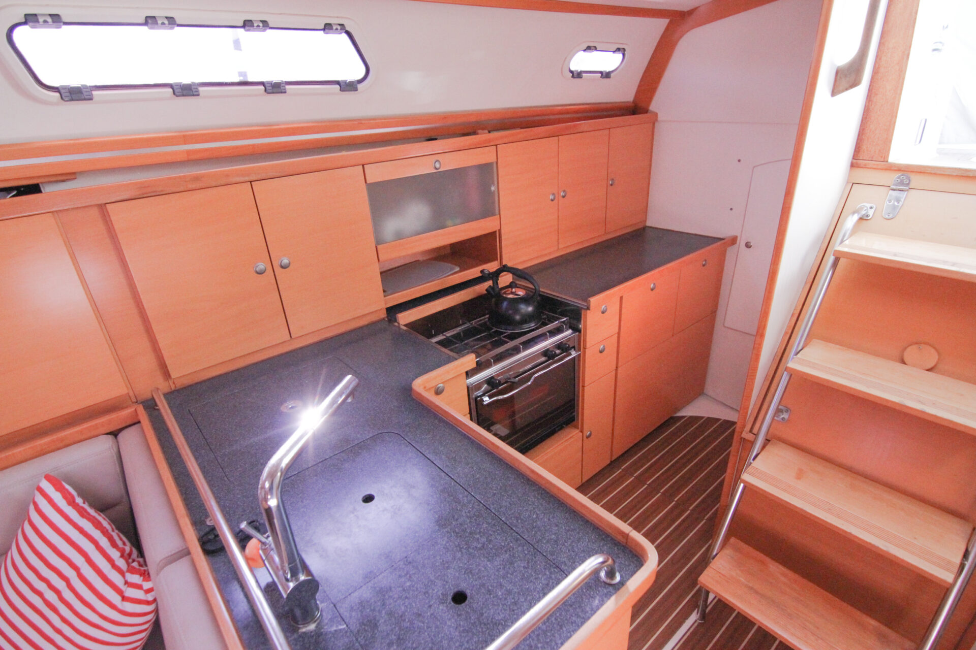 This is the 2.5 cabin configuration providing a master cabin forward, a large aft cabin and a utility room with squabs that can double up as a third small cabin. The additional benefit of this layout is the enlarged galley with additional bench space and storage.