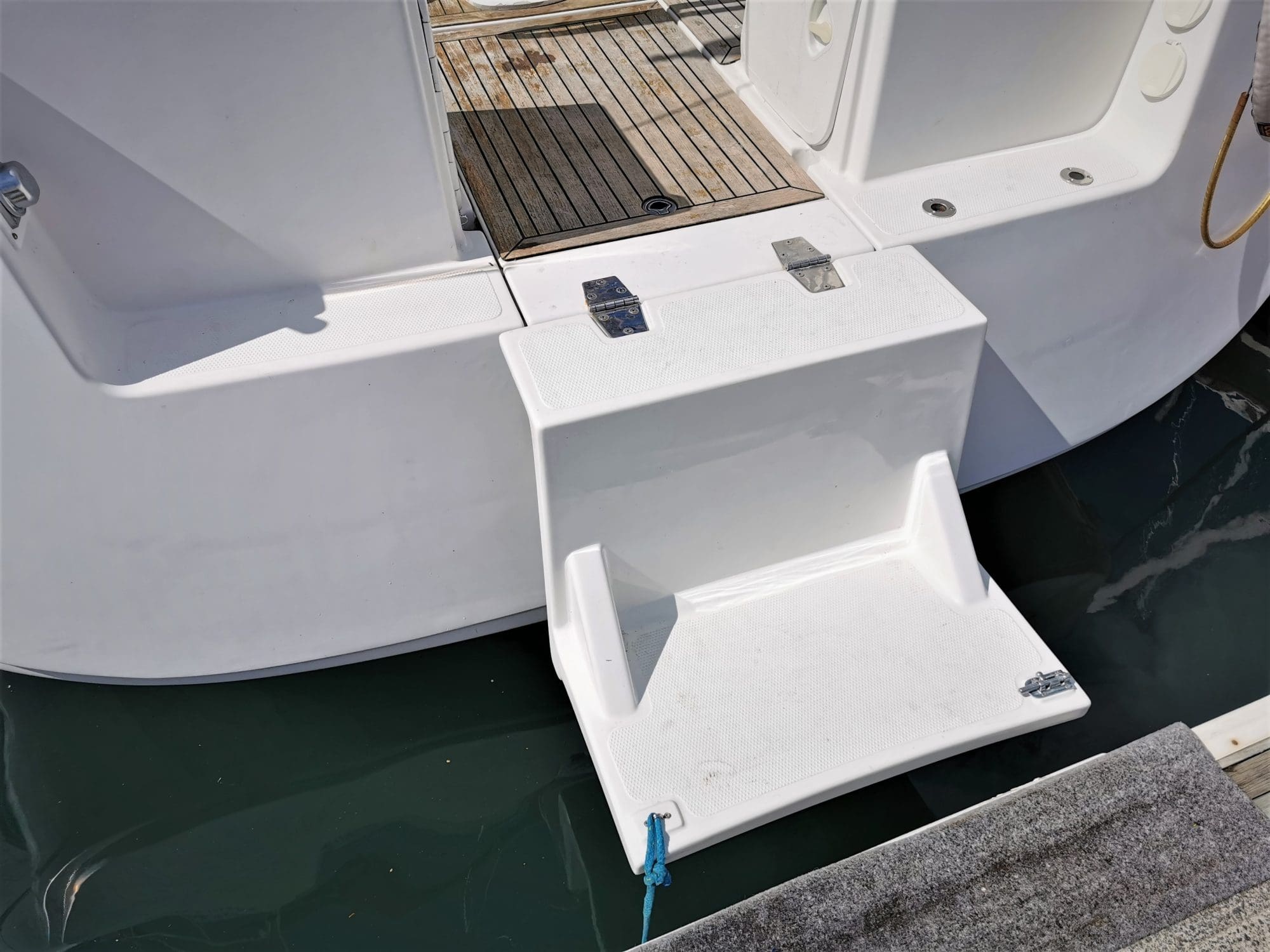 This mark II version of the 400E benefited further from a facelift resulting in the modern yet timeless deck and porthole configuration. The addition of the optional fold down transom steps and SS ladder was another fantastic innovation giving easy access to the water when at anchor. The upgraded Lewmar folding helm wheel helps to give easy access from the cockpit to the transom.