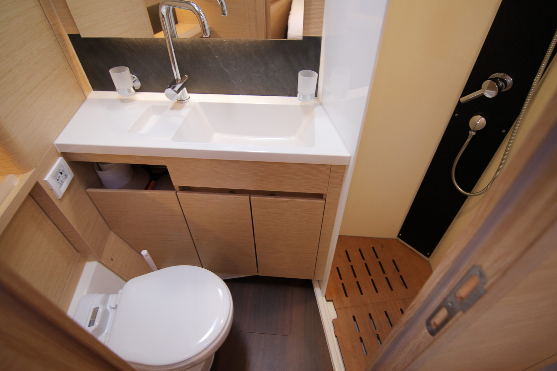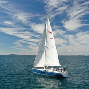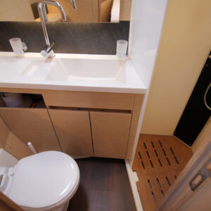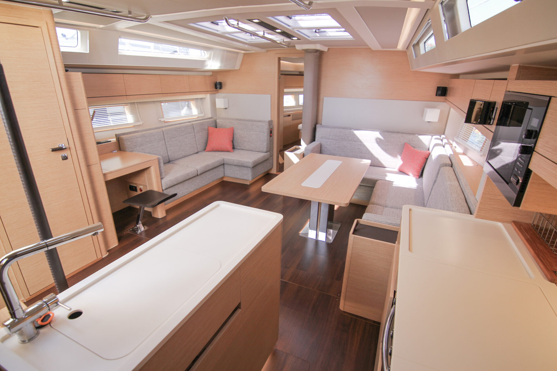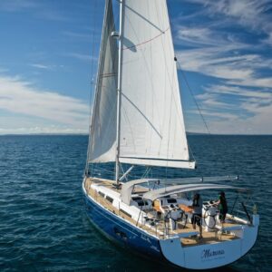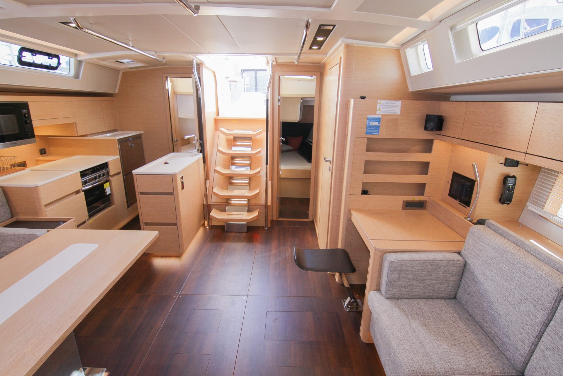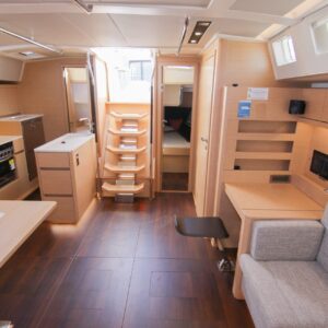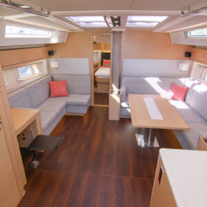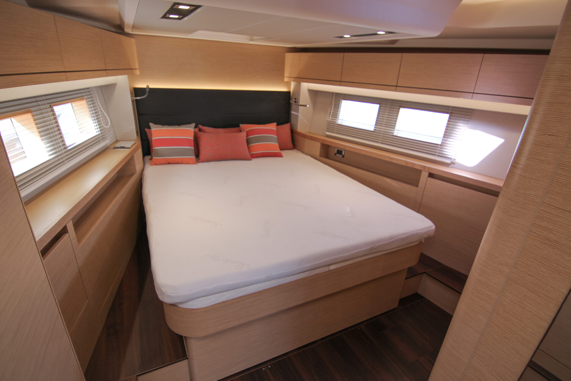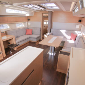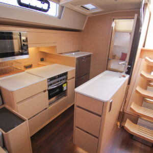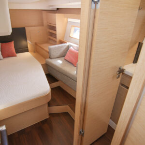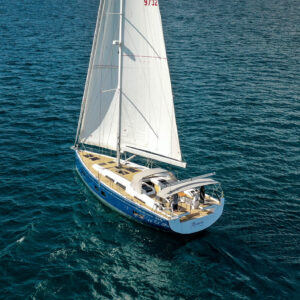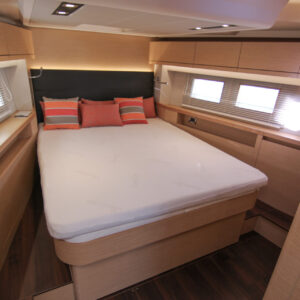 This model made great leaps forward in yacht design with many innovative features. She is set up to enable the skipper to sail short or even single-handed. Once you have had assistance casting off the dock lines all sailing and motor controls are at your fingertips and assisted by electric winches, furlers, and retractable bow and stern thrusters.
