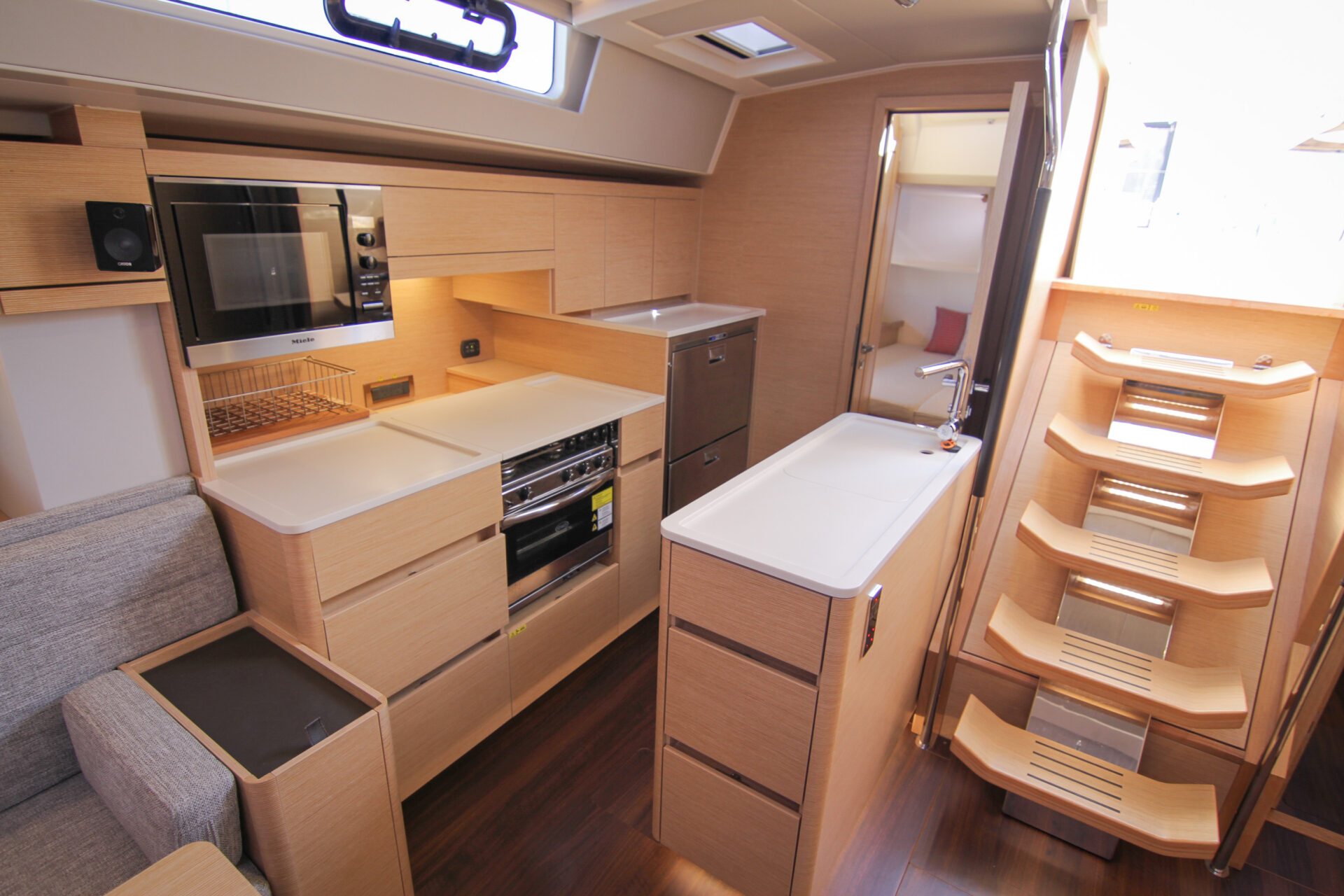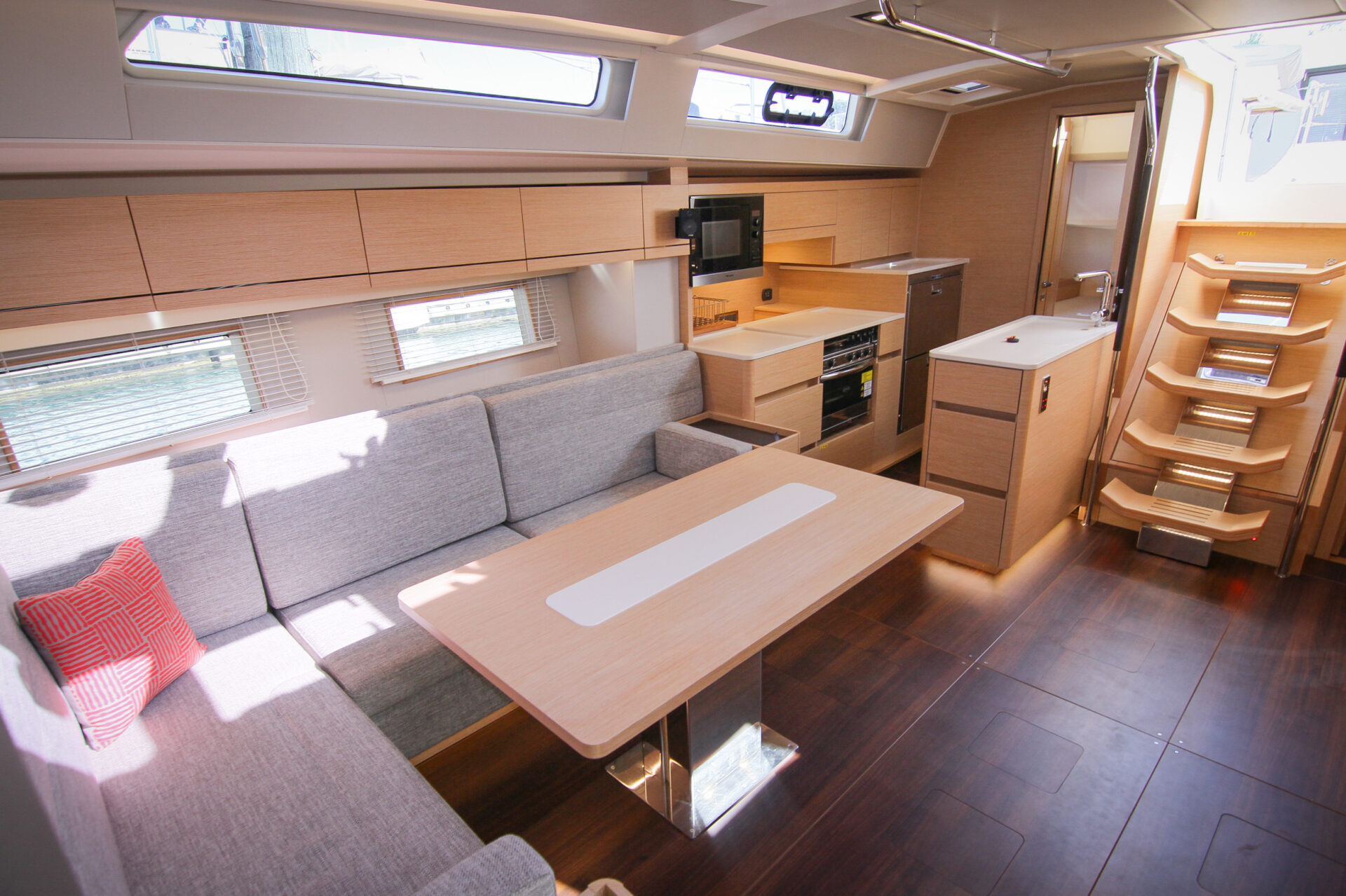 The voluminous saloon area can cater to many guests with two L-shaped seating areas and a large dining table. The position of the Galley is ideally placed to serve from and designed to be able to use while underway. There are multiple storage options and great work surface areas.