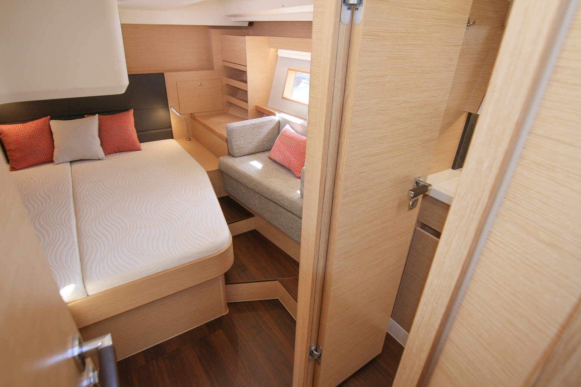 Her accommodation layout provides two master cabins and a smaller double. The large master cabin forward boasts an island berth, plenty of floor space, and an abundance of storage options. The ensuite is roomy with a dedicated shower cubicle. The VIP cabin, Port aft has a large berth with side access, a sofa, and an ensuite with a shower cubicle. The third cabin to Starboard is a double with an ensuite.